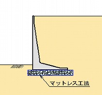 マットレス工法とは基礎地盤が軟弱な場合に、構造物の基礎部をジオテキスタイルと中詰材を用いて立体的かつ盤状に包み込む工法です。