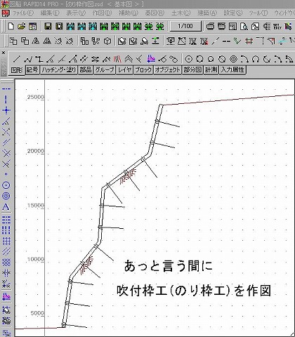 - 凹凸のある不規則なのり面断面図にのり枠(吹付け枠)を自動作図します。