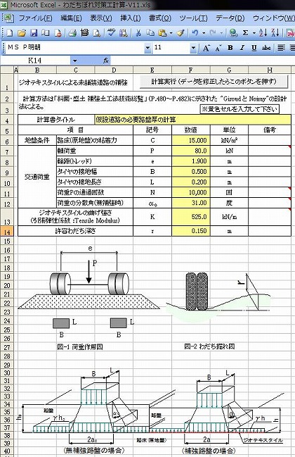 - 軟弱な路床地盤の上に仮設道路や交通量の少ない道路を未舗装で構築する場合に、わだち堀れ対策としてジオテキスタイルを用いた場合の必要路盤厚を計算するものです。