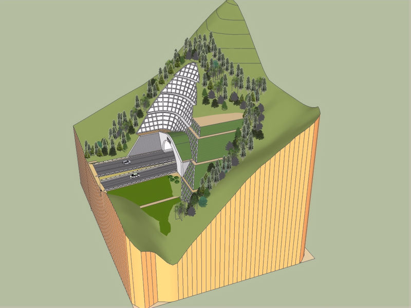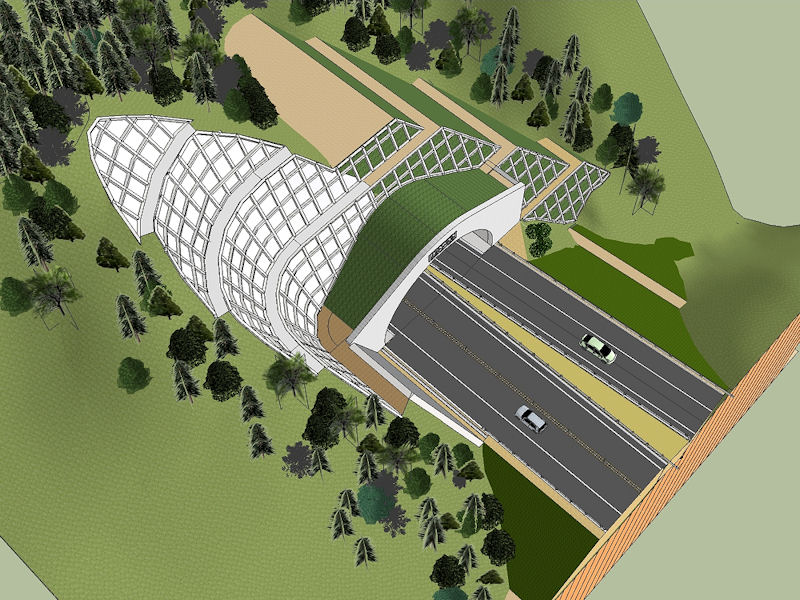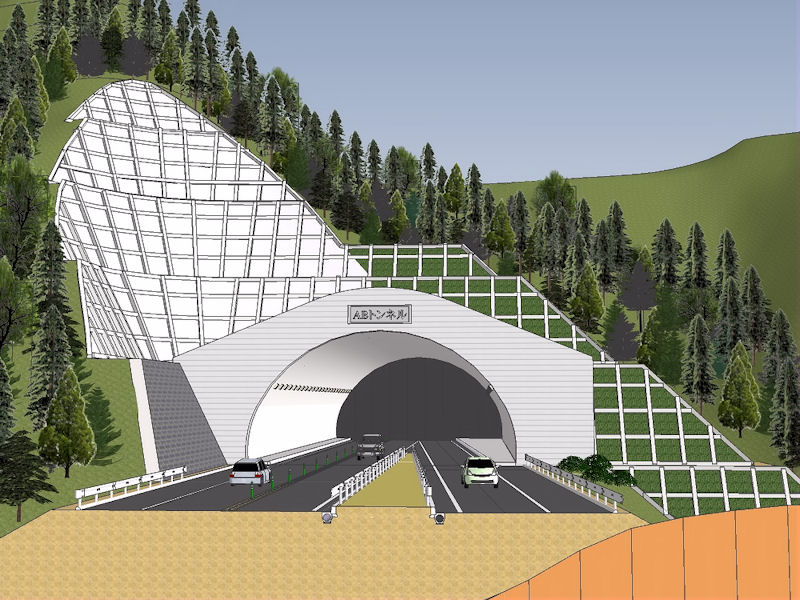 押え盛土と長大切土を伴うトンネル坑口を正面から望む