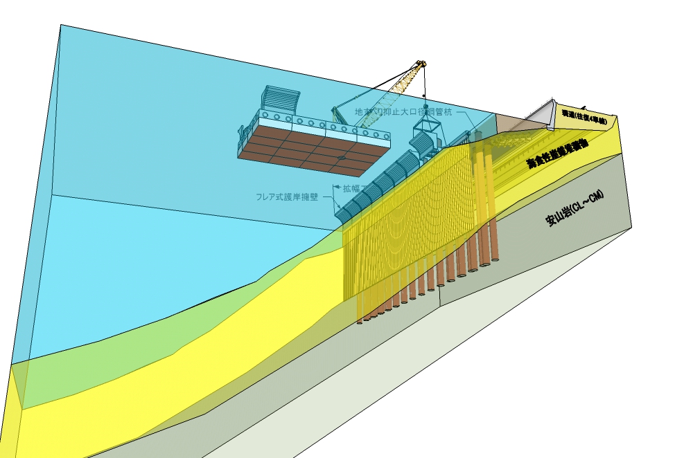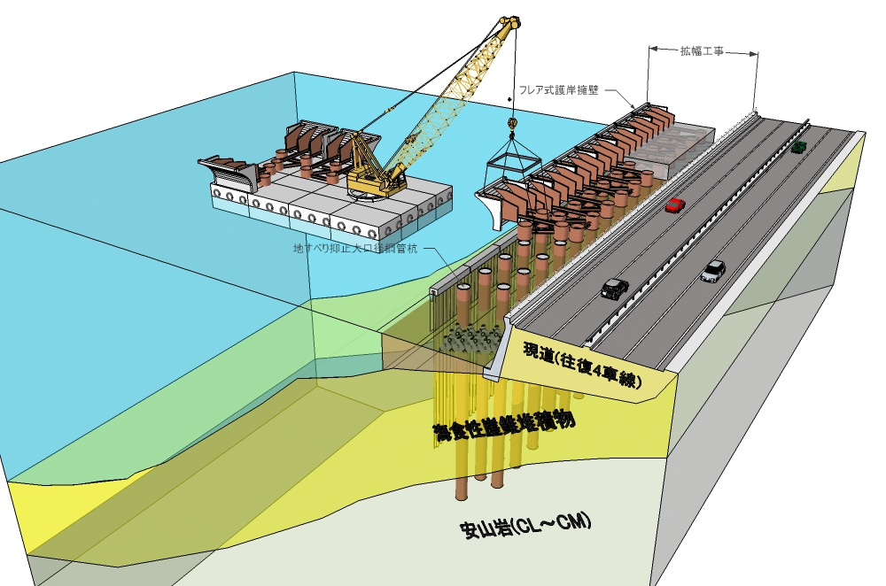 地すべり抑止鋼管杭にフレア式護岸擁壁をドッキング